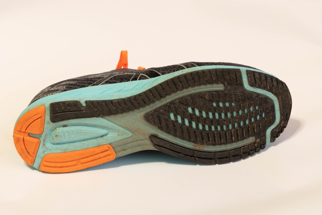 A sola é composta quase na totalidade por borracha com bastante profundidade o que se deverá traduzir – espero eu – numa elevada longevidade da mesma. A mesma é pautada pelo sistema de torção da ASICS que providencia o referido controlo de tracção. Este sistema passa quase despercebido durante o treino mas é bastante bem vindo para alguém que é pronador, especialmente num sapato cujo objectivo são andamentos mais elevados.