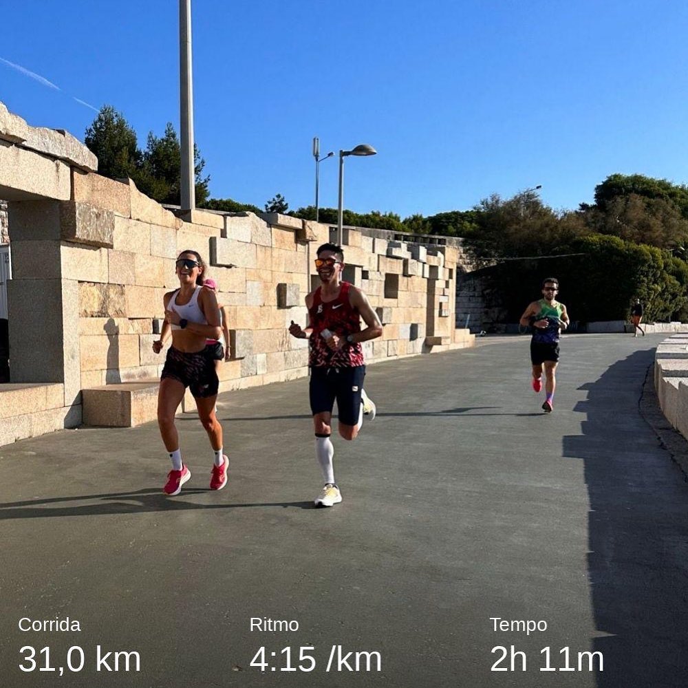 Sábado foi dia de descanso e Domingo o objectivo era fazer 31 kms (o último km já em cooldown) na companhia da Rita e do Fábio. Para variar um pouco optámos por fazer um percurso A->B começando no Parque das Nações e acabando em Carcavelos. Este treino correu muito melhor que o da semana passada sendo que o ritmo pareceu sempre confortável q.b. Acabámos por fazer um ritmo médio final de 4:15 com os ultimos 2 quilómetros abaixo de 4 (o último abaixo de 3:50). Um excelente sinal!